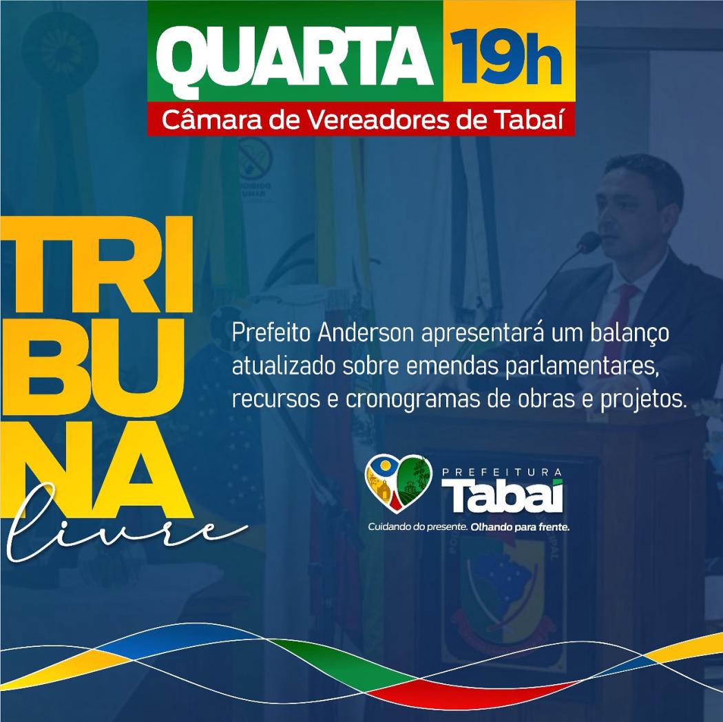 Nesta quarta-feira, às 19h, o prefeito Anderson de Azevedo Vargas participa da Tribuna Livre na Câmara de Vereadores de Tabaí, apresentando um balanço atualizado sobre emendas parlamentares, recursos, obras e projetos em andamento no município.