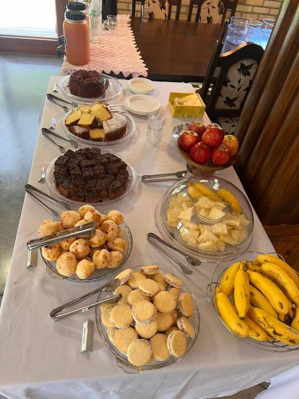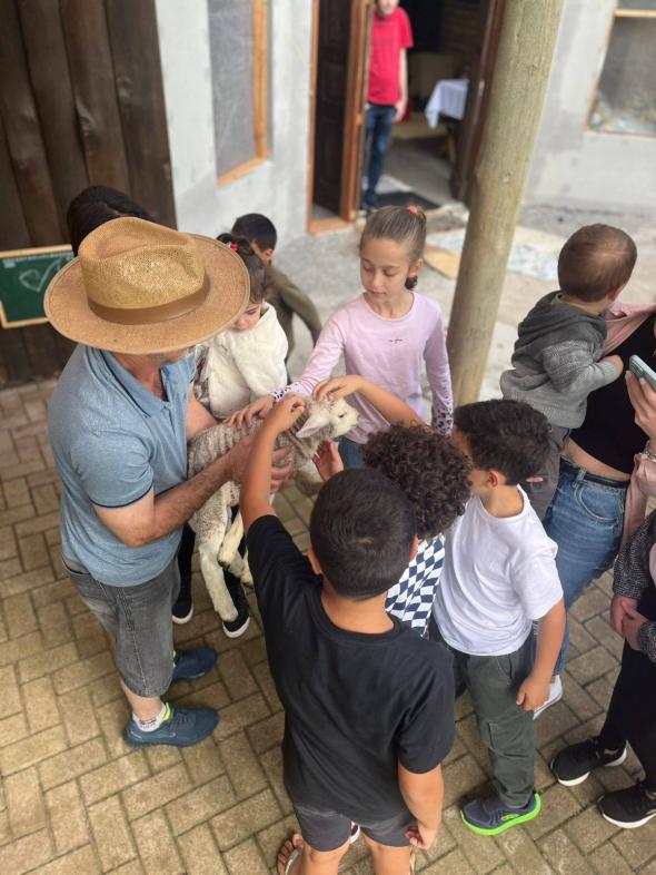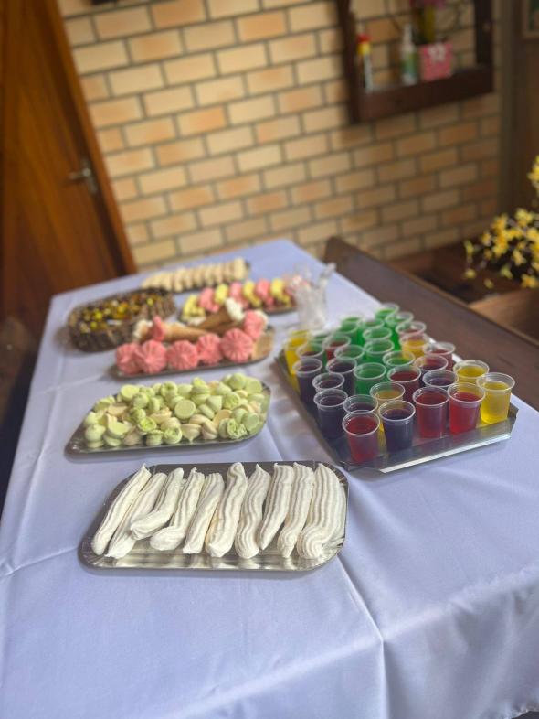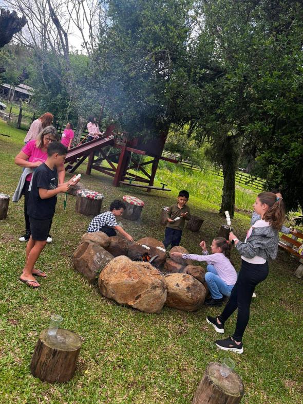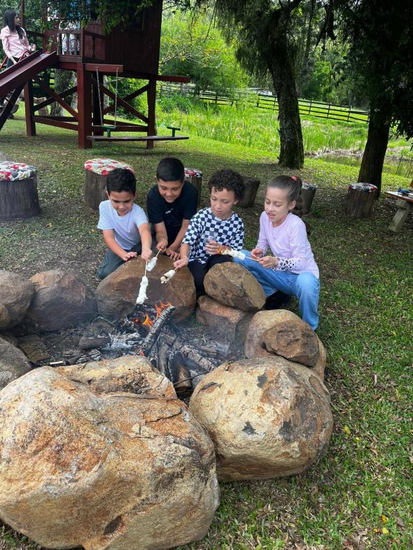 Durante todo o encontro, houve momentos de pura alegria: brincadeiras ao ar livre, jogos em grupo, caça ao tesouro, pintura, roda de histórias e outras atividades infantis. Não faltaram guloseimas para adoçar os sorrisos — pipoca, doces, frutas e lanches feitos com carinho. Ao mesmo tempo, o cenário natural da estância convidava à contemplação: trilhas suaves, espaços de descanso sob árvores, cantos de pássaros e convivência com animais da fazenda local — galinhas, coelhos e outros bichos que encantaram as crianças e os adultos com sua presença simples e encantadora.