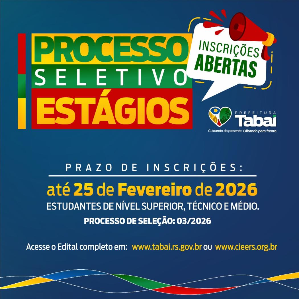 A Prefeitura de Tabaí abriu inscrições, até 25 de fevereiro de 2026, para o Processo Seletivo de Estágios destinado a estudantes de nível médio, técnico e superior.