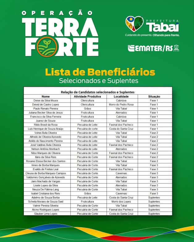A Prefeitura de Tabaí, em parceria com a Emater/RS-Ascar, divulgou a lista de beneficiários do programa Operação Terra Forte, iniciativa que busca incentivar a produção rural e fortalecer as famílias agricultoras do município.