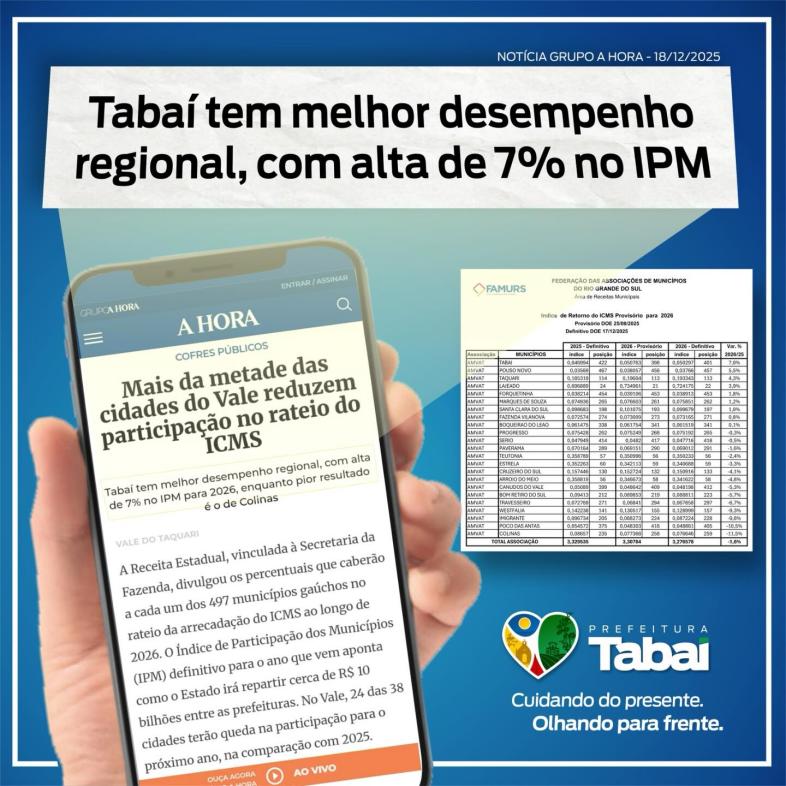 O IPM é o índice que define a participação de cada município na arrecadação do ICMS — imposto estadual fundamental para o financiamento de serviços públicos. A elevação do índice significa maior retorno de recursos para Tabaí, o que pode ampliar oportunidades de investimento em áreas essenciais como educação, saúde, infraestrutura e demais políticas públicas.